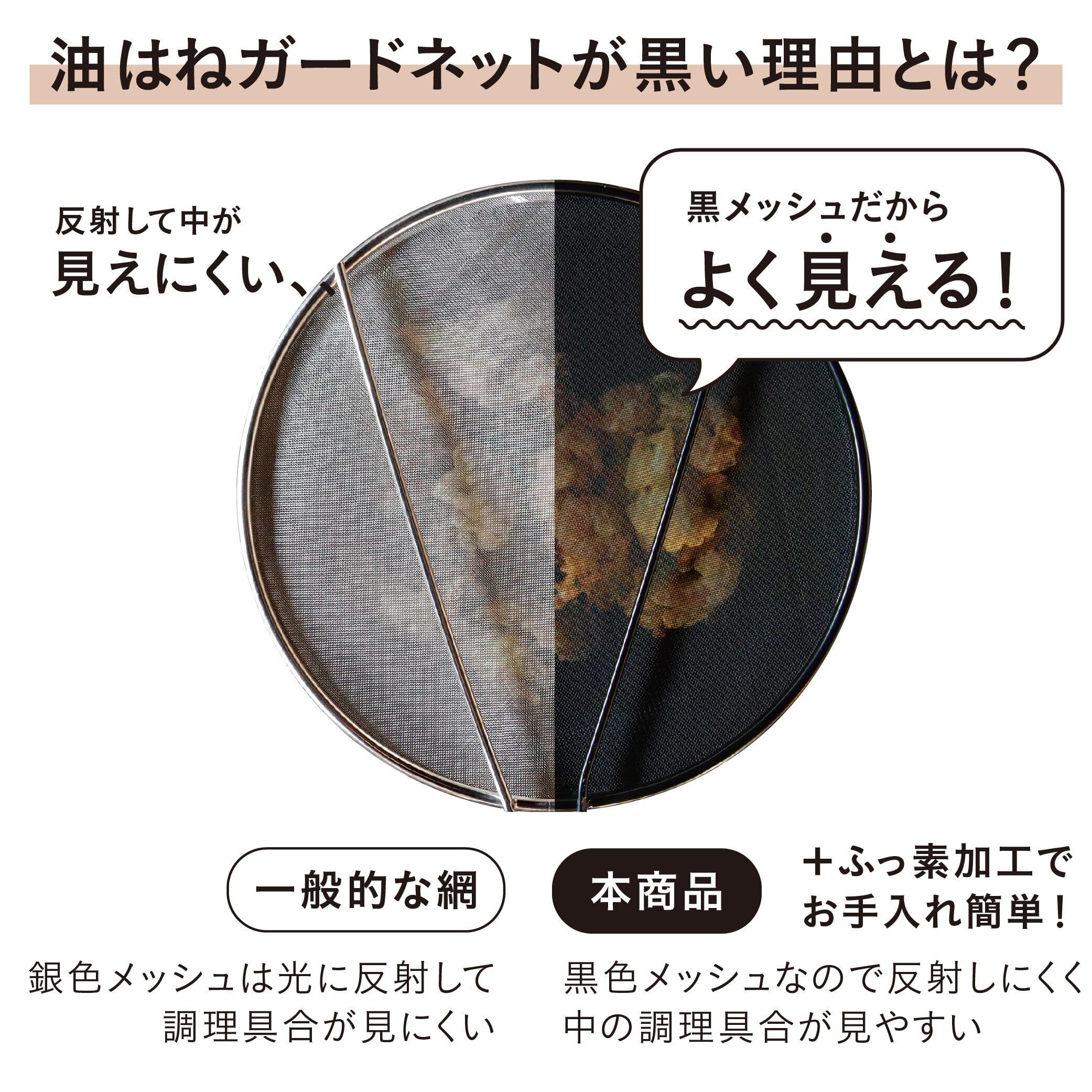 ネットは、ふっ素加工を施した黒メッシュなので反射しにくく、調理中も食材の様子を確認しやすいのもポイントです。揚げ物だけでなく、調理中の煮物の飛び散りも防いでくれます。