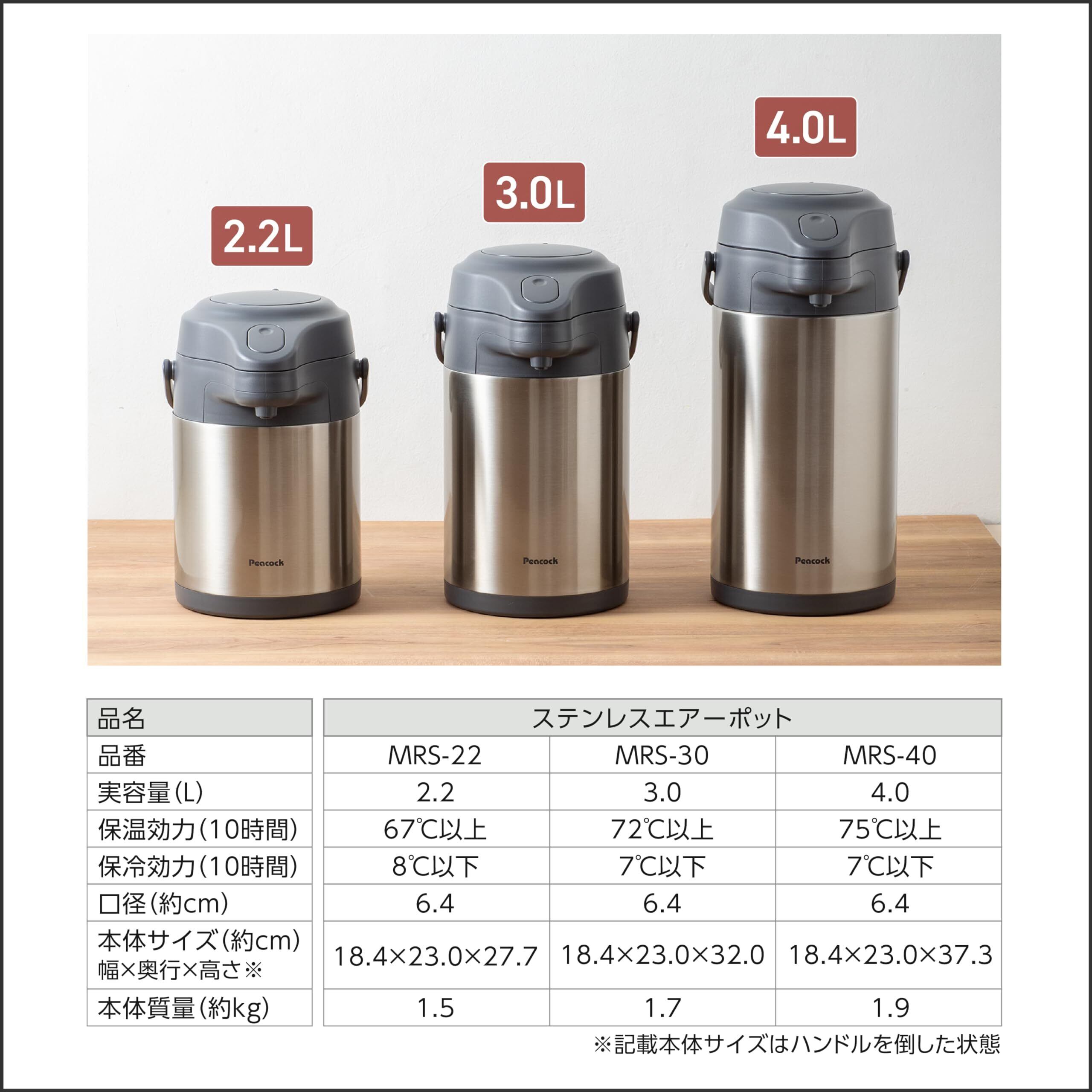 【電気いらずで保温保冷できる】ピーコック魔法瓶 ステンレス エアーポット 4リットル 保温 保冷 省エネ 広口 魔法瓶 ポット 卓上 湯沸かし 給水 節電 省エネ2.2L MRS-40 XA
