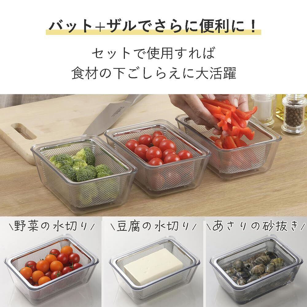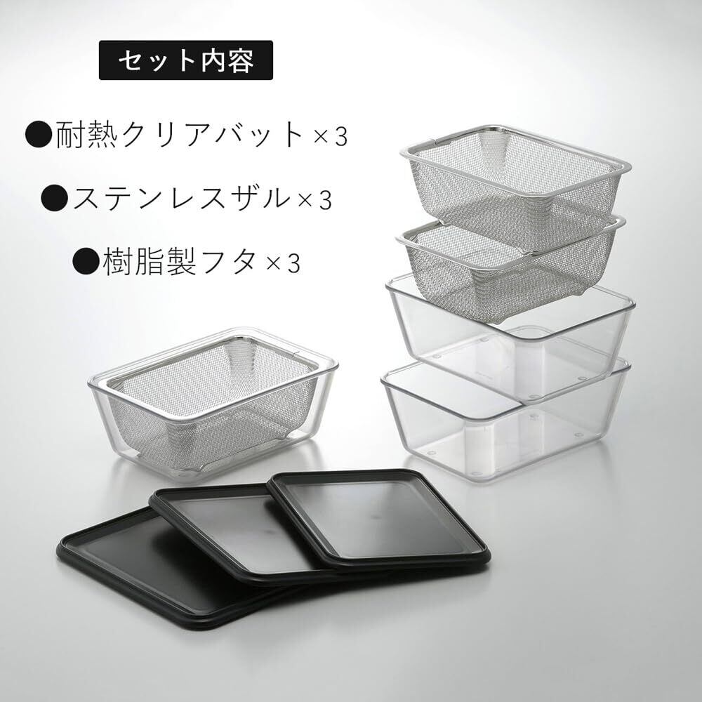 セット内容:バット・フタ・ザル ×各3、食器洗浄機:使用可、電子レンジ:バットのみ使用可