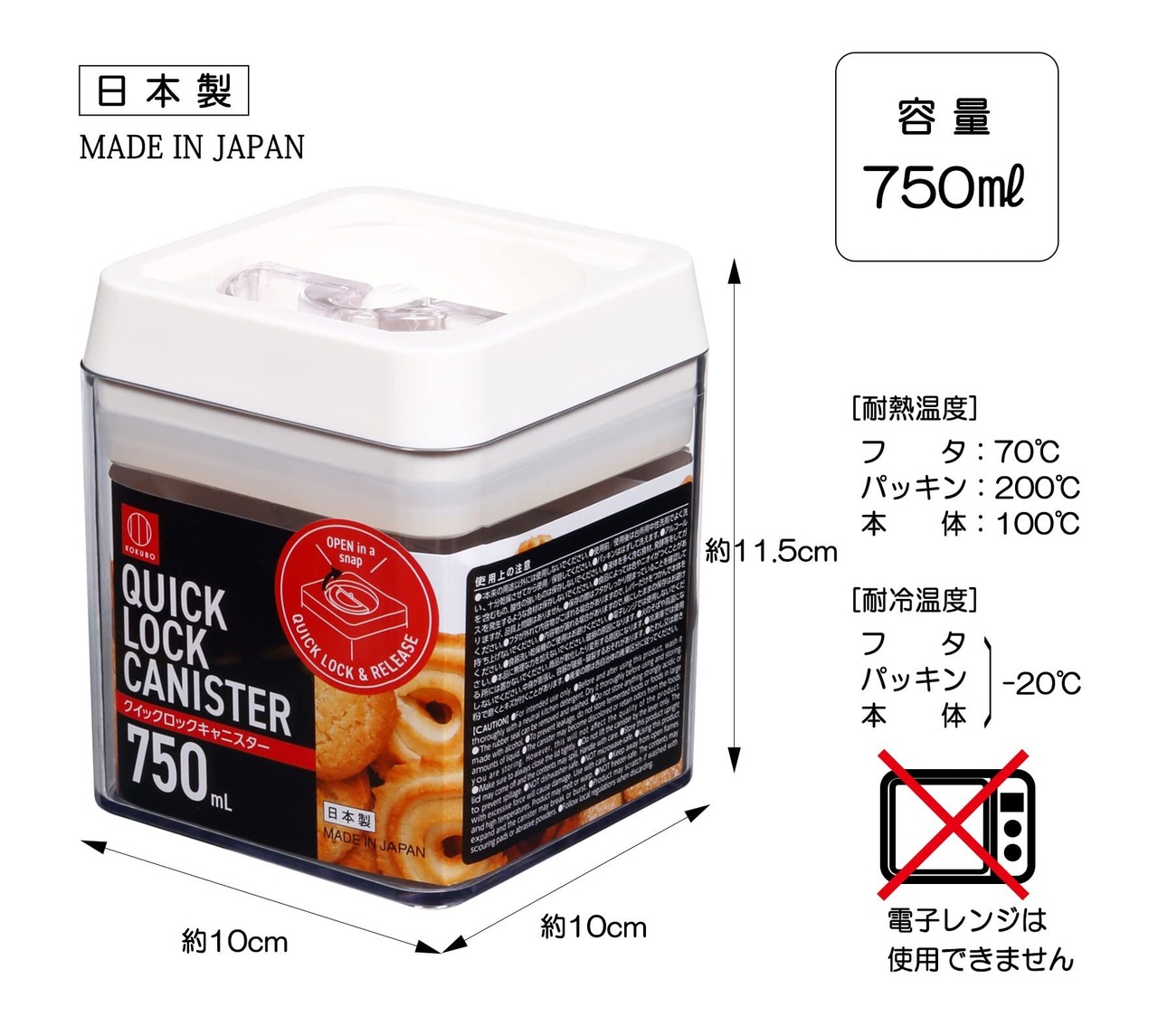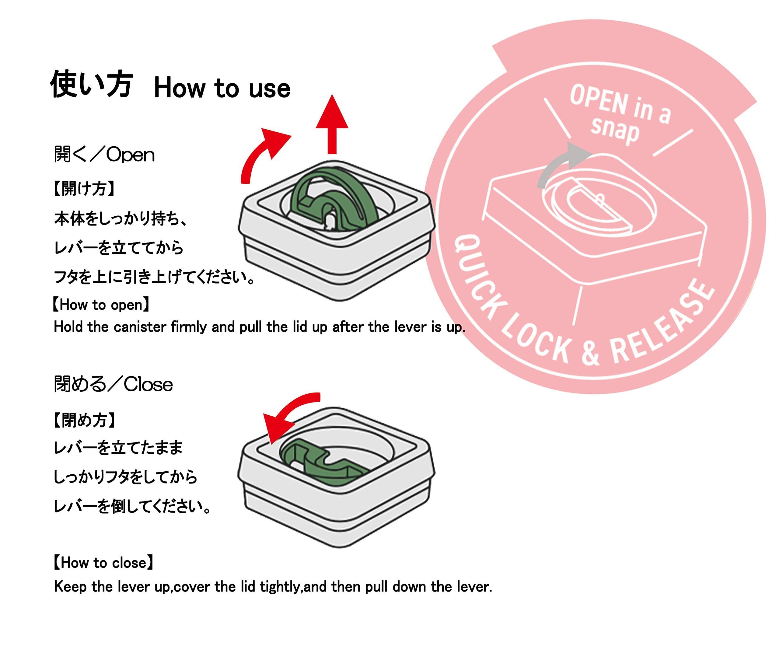 透明なプラスチック容器と白いフタで、食品を密閉保存するキャニスターです。フタをしてレバーを倒すと、テコの原理とバネの力で、レバーの支柱とフタ底が引き上げられ、パッキンと容器が密着して、瞬時に密閉できる仕組みになっています。レバーを起こすと、フタ底部が下がり、容器とのすき間に空気が入ってポンッと簡単に開けられます。レバー操作だけですばやくロックと解除ができるので、何かと忙しい食品の出し入れ時に便利です。容量は750mL、1500mL、2250mLの3サイズ。レバーの色はピンク、グリーン、グレーの3色から選べます。シンプルな形で中身が見えるのもいいところ。見せる保存にも。