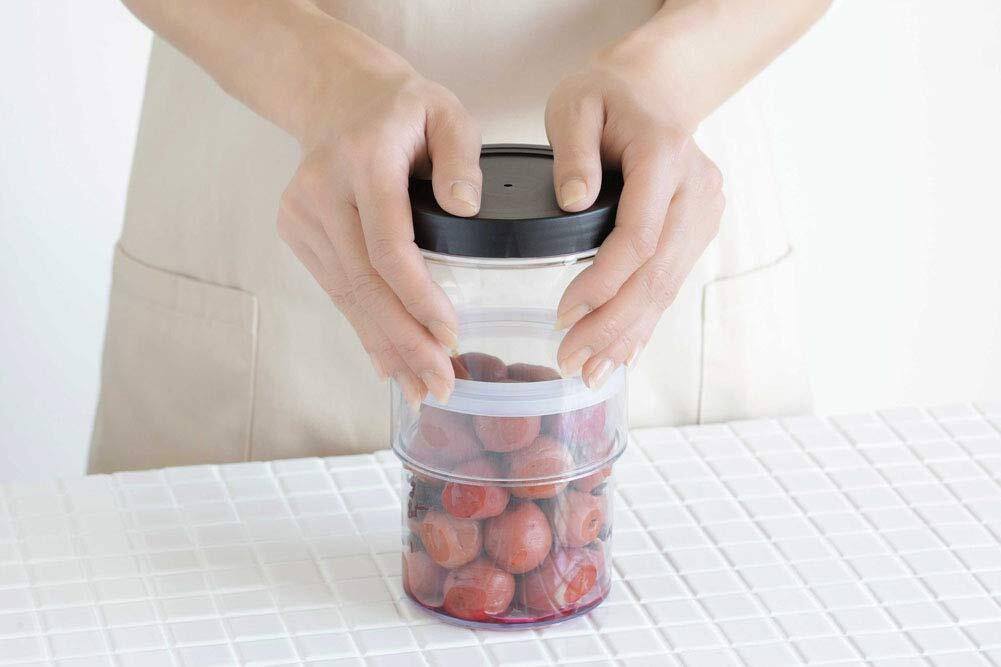 押すだけで簡単に空気を出す!食材の鮮度を保つ密閉容器です。<br>内容量に応じて高さを調節出来る新感覚の保存容器です。<br>いらない空気を抜いて食品の酸化防止に大活躍。<br>本体が透明で中身が分かりやすく、女性にも軽くて持ちやすいサイズです。<br>電気不要で簡単密閉。