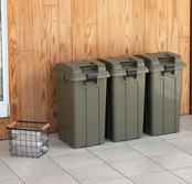 丈夫で屋外の景観になじむカラー分別ペール<br>ハンドル付きで開けやすく、バックルでしっかりロックできる