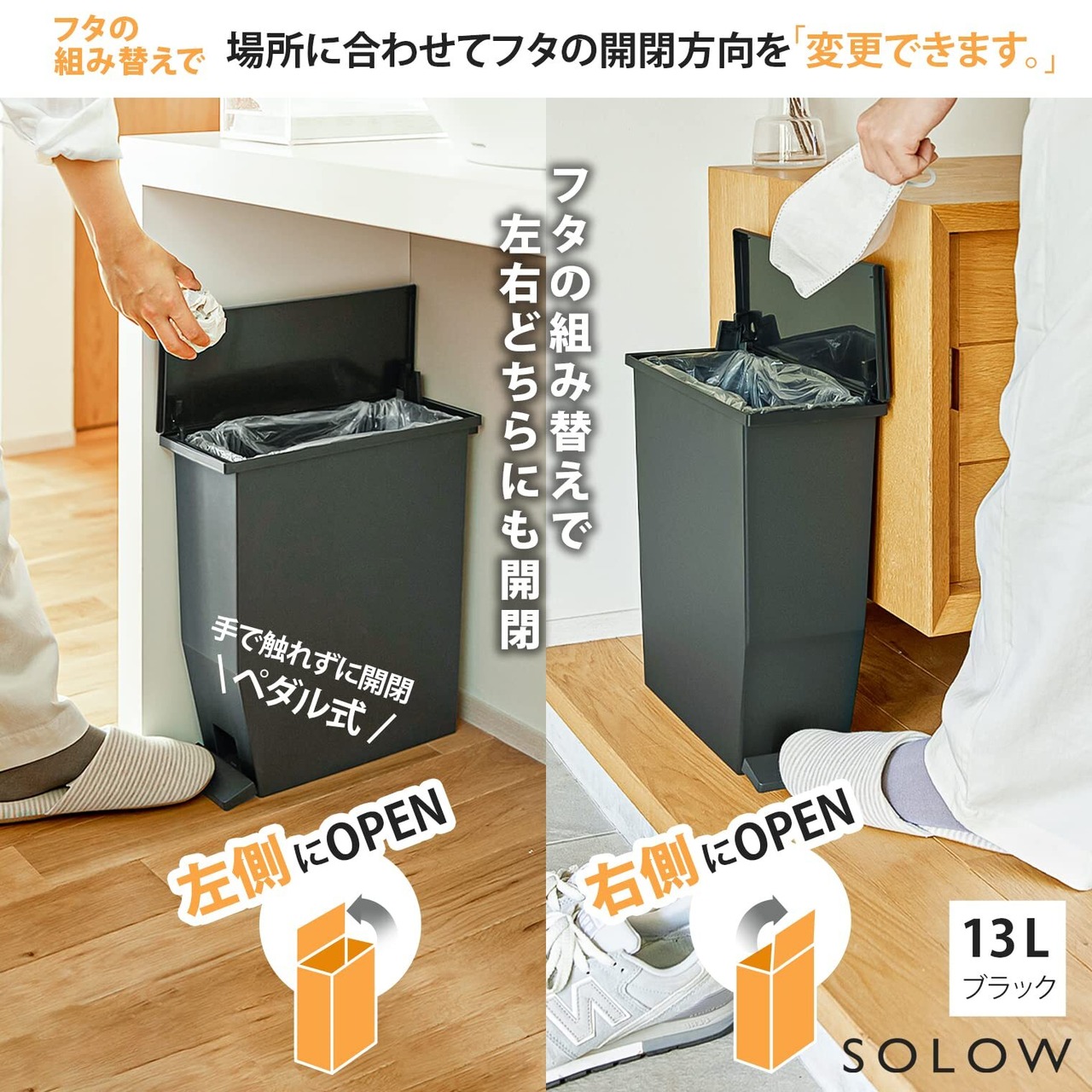 リス(RISU) ソロウ ゴミ箱 ふた付き 13L ブラック ペダルオープン 両開き 抗菌 加工 日本製 おしゃれ キッチン 分別 スリム キャスター付き ダストボックス 179771