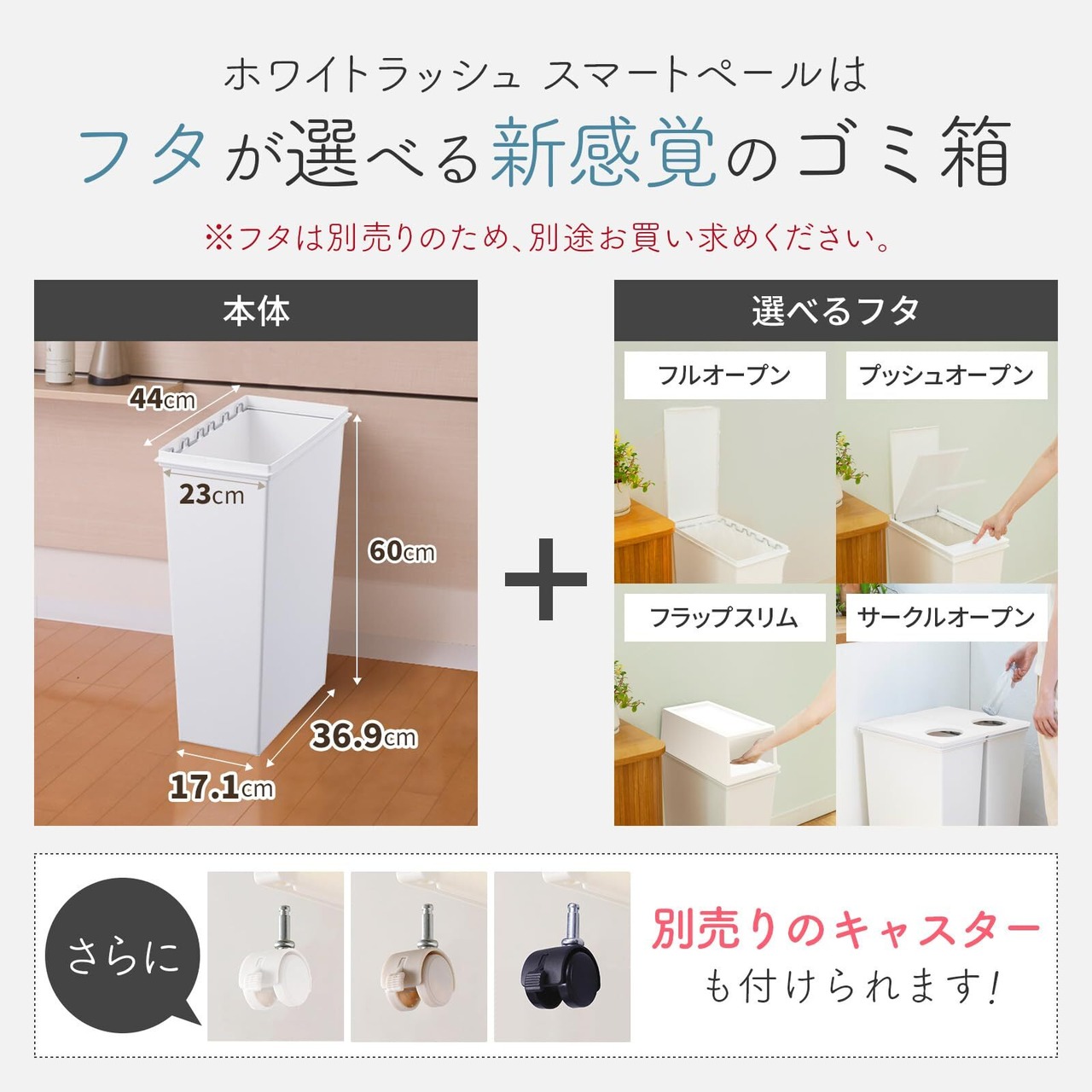 狭いところにも置けるスリムなゴミ箱。用途に応じて選べるフタは全4種類!