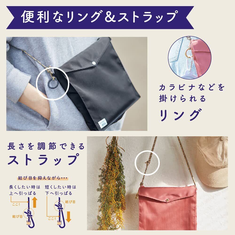 約5cmのマチがあり、たっぷり収納できるマグネットホック付きの前面ポケットと、小物や厚みがないものに適した背面ポケットが付いており便利です。また、カラビナなどを掛けられるリングも付いているので、バッグに入らないものも掛けて一緒に持ち歩けます。