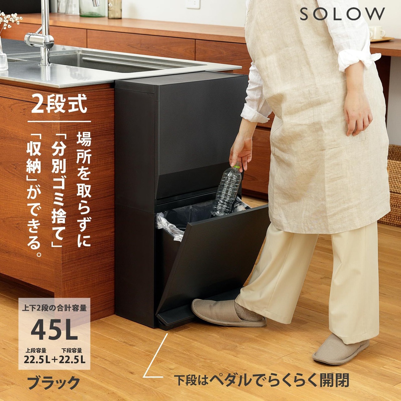 リス(RISU) ゴミ箱 ダストボックス SOLOW通路で使えるペダル分別ストッカー 2段 45L ブラック 日本製 上下 各 22.5L 大きく開く 薄型 抗菌 加工 おしゃれ キッチン シンプルなデザイン キャスター付き 収納にも GSLW021