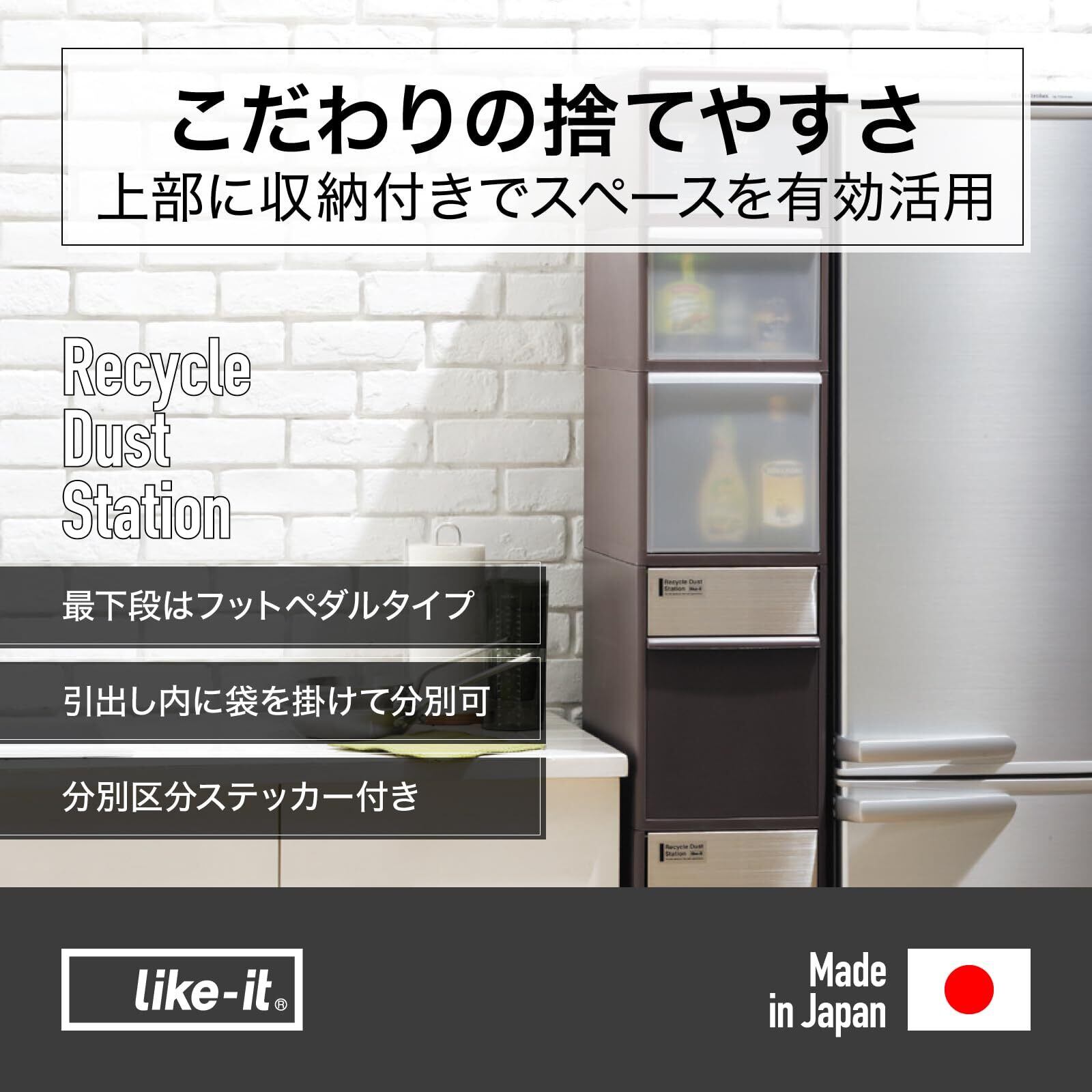 上部3段が収納ユニット、下3段が資源ごみを楽に分別できるペダル式ゴミ箱。資源ごみをひとまとめにストックできる分別容器3段タイプで、引出し内部の左右の切れ込みに取っ手付きポリ袋をセットするだけで簡単に多種分別が出来ます。中断2段はステンレスのスイングパネル式で最下段はフットペダル式です。