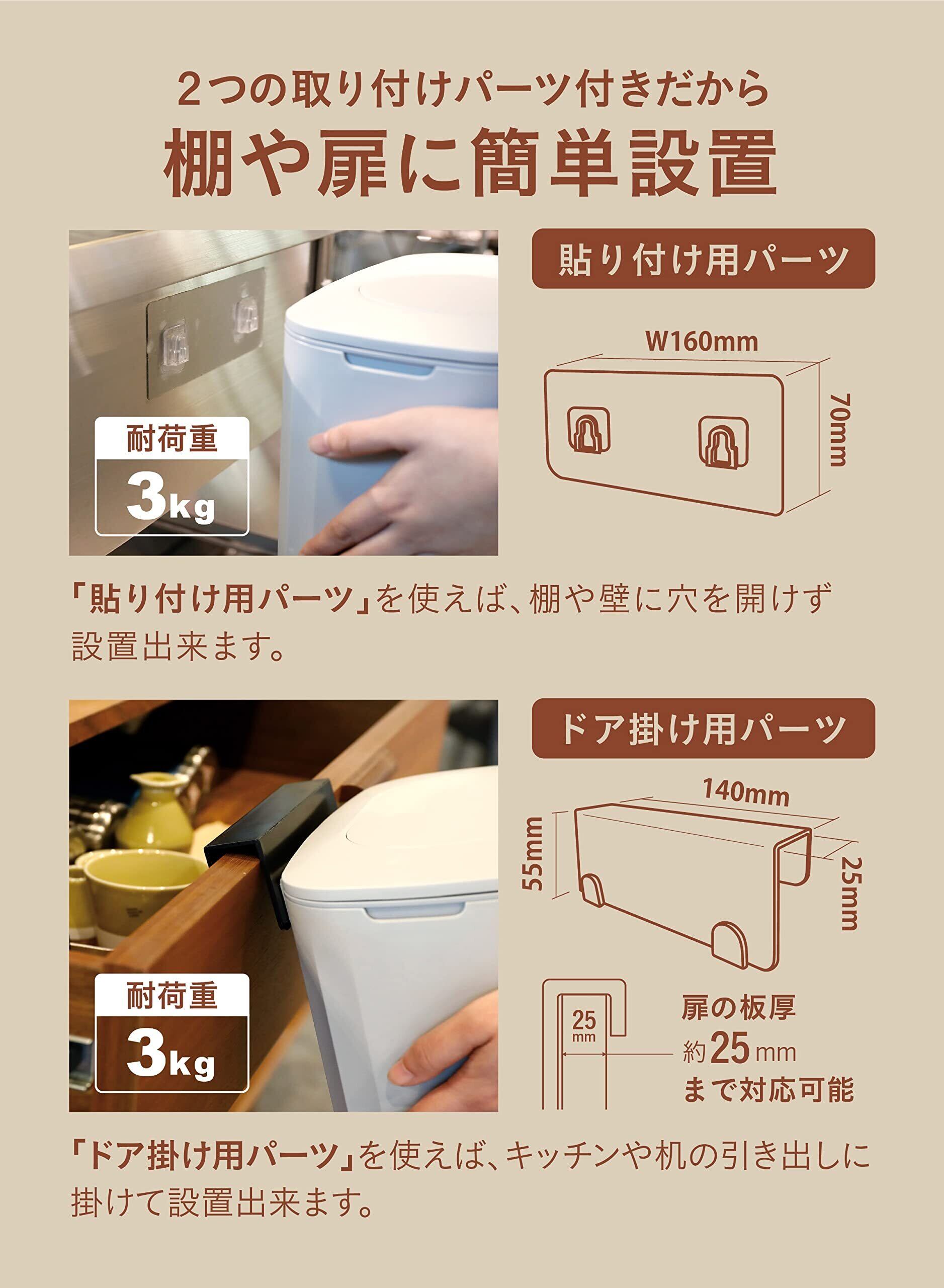 「貼り付けパーツ」を使えば、、壁や棚に穴を開けず設置が可能です。「ドア掛けパーツ」をを使えばキッチンや机の引き出しに掛けて設置が出来ます。使いたい場所に合わせたお好みの取り付け方が出来ます。