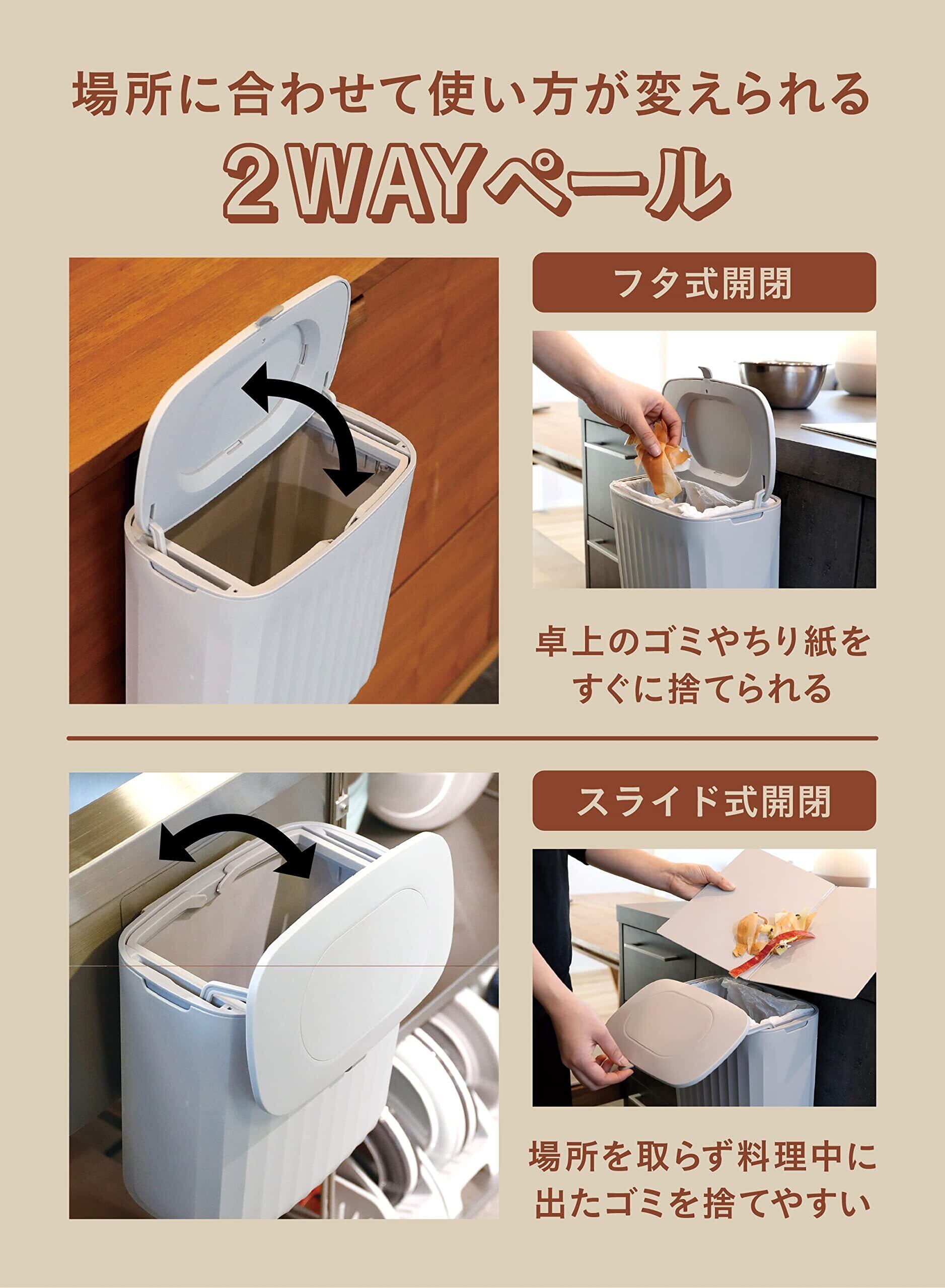 上部の蓋は手前にスライドさせる「スライド式」と、上に開く「フタ式」の方法で開閉できます。広口設計なので、ゴミをこぼすことなく捨てやすく、まな板から直に捨てるときにも安心です。