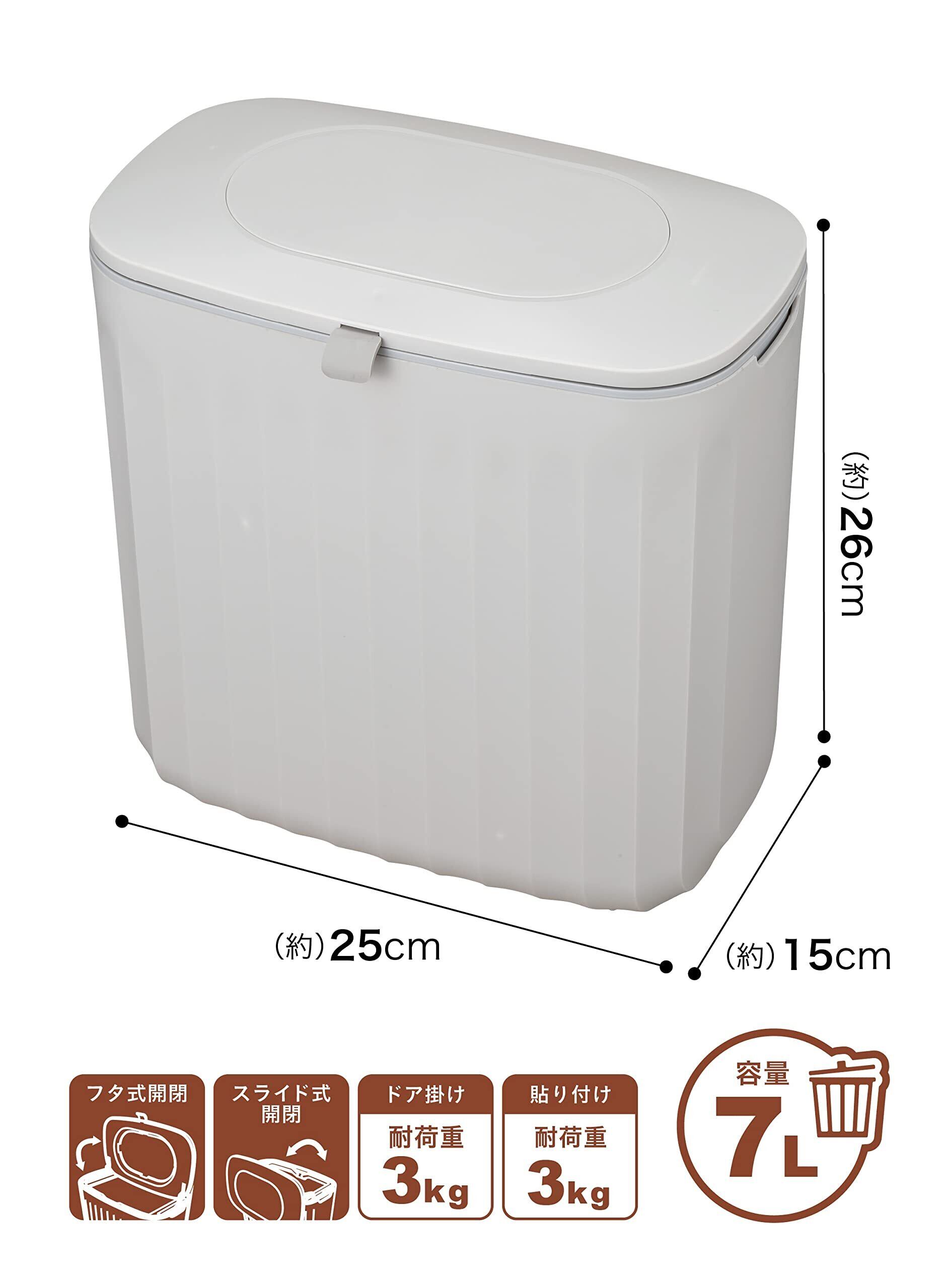 主材質:[本体]ポリプロピレン、[ゴミ袋ストッパー]耐衝撃性ポリスチレン、[つまみ部分]スチレンブタジエンゴム、[脚部分]EVAフォーム、[ドア掛けパーツ]ABS樹脂、[貼り付けパーツ]ポリウレタン