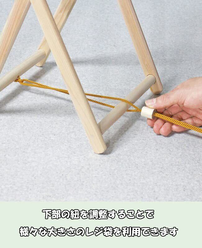 ●レジ袋を掛けてそのまま使えるレジ袋スタンドです。●国産ひのきを用いて国内の工場で製造している商品です。●下部の紐を調整することでスーパー等の大きいサイズ、コンビニ等の小さいサイズ、それぞれでお使いいただけます。●使わない時は折りたたんでコンパクトに収納。折りたたみ時の厚さは約5cmです。●持ち運びも便利なので、アウトドア等でも使えます。