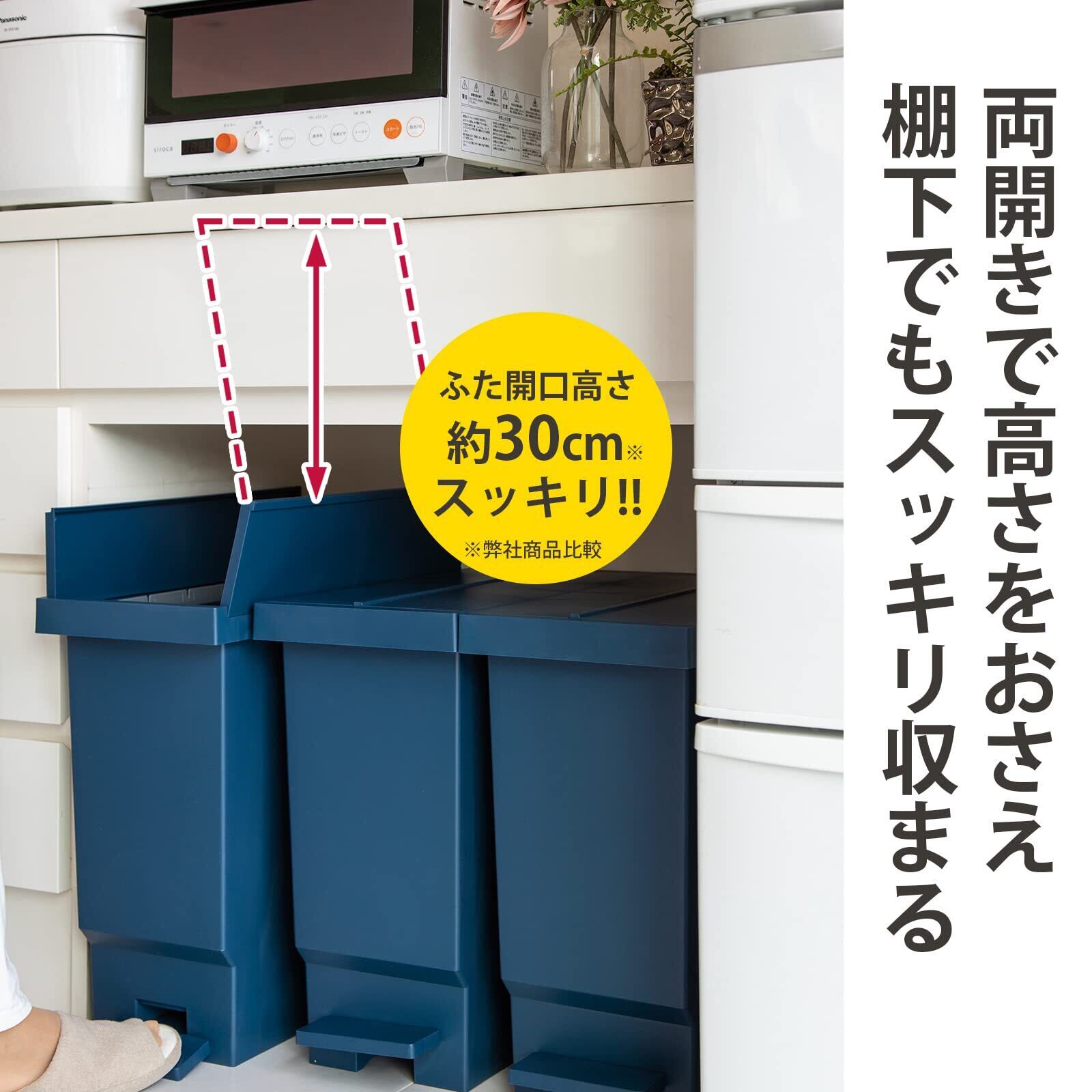 蓋が両開きだから通常のペダルペールより30cmほど高さを抑えます。