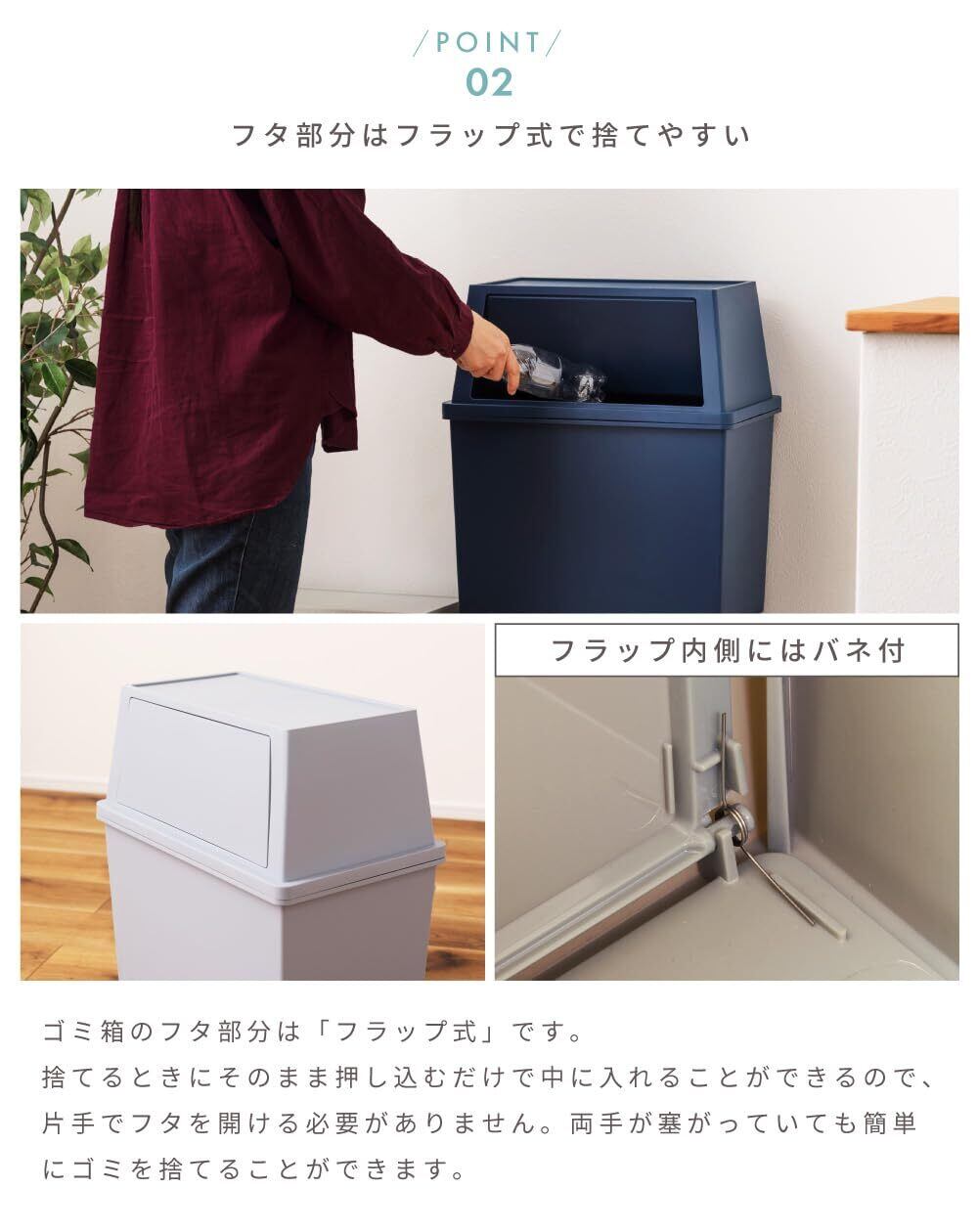 ●袋止め付き・・・ゴミ袋のズレ落ちを防止する袋止め付き。2カ所分離タイプなので、片方ずつ留められてスムーズに取り付けることができます。