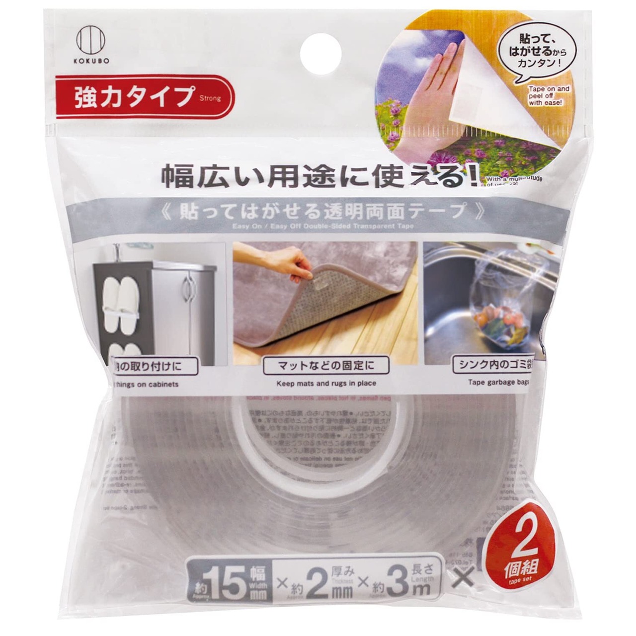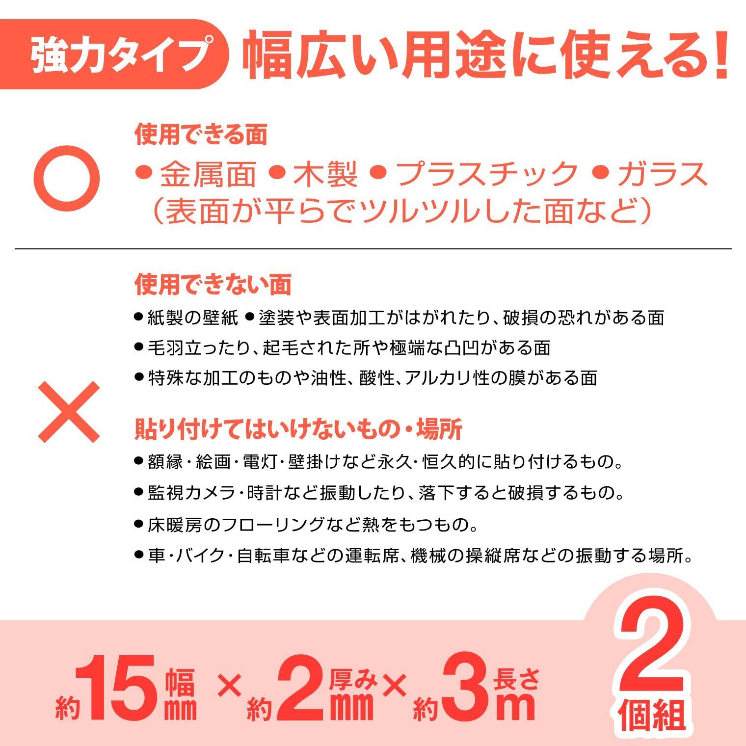 ◎貼ってはがせる透明両面テープ。強力タイプ。◎アクリルゴム製で、弾力性、伸縮性があります。◎粘着力が強く、平らでツルツルした面にピタッと貼れます。◎貼ってはがせるので、気軽に使えます。◎ハサミで自由にカットできます。◎透明なので目立ちません。◎幅広い用途に使えます。◎穴が開けられない壁に物を貼るときに。◎マットなどを床に固定するときに。滑り止めに。◎シンク内にゴミ袋をちょい留めするときに。◎デスク周りやキッチンでメモ紙を見やすい場所に貼りたいときに。◎袋などを貼り付け収納したいときに。◎金属面、木製、プラスチック、ガラスに(平らでツルツルした面など)◎1個あたりのサイズ約 幅15mm×厚み2mm×長さ3m。◎たっぷり使える2個組。DIYなどに。◎耐荷重400g(約115mm×15mm使用の場合) ※目安です。使用状況により異なります。
